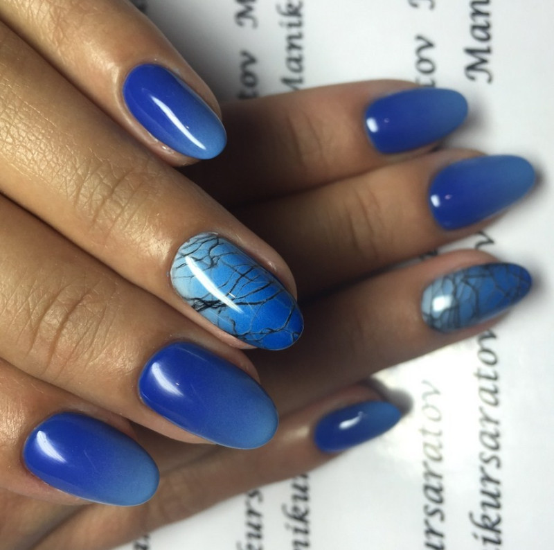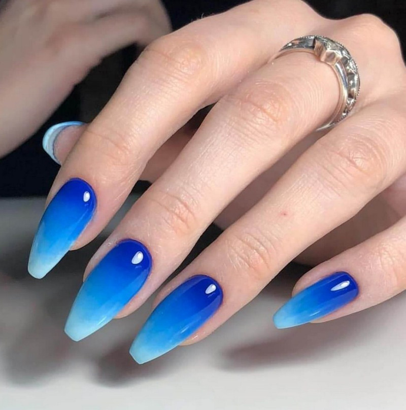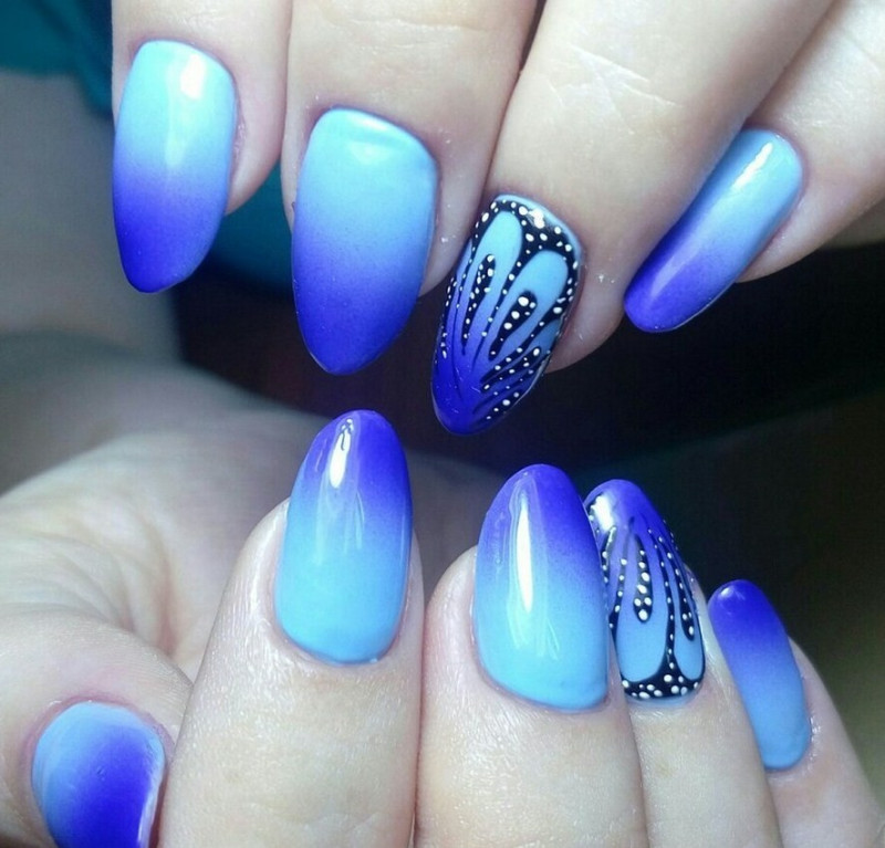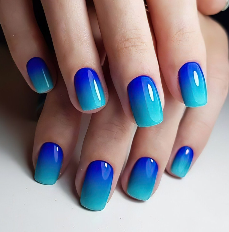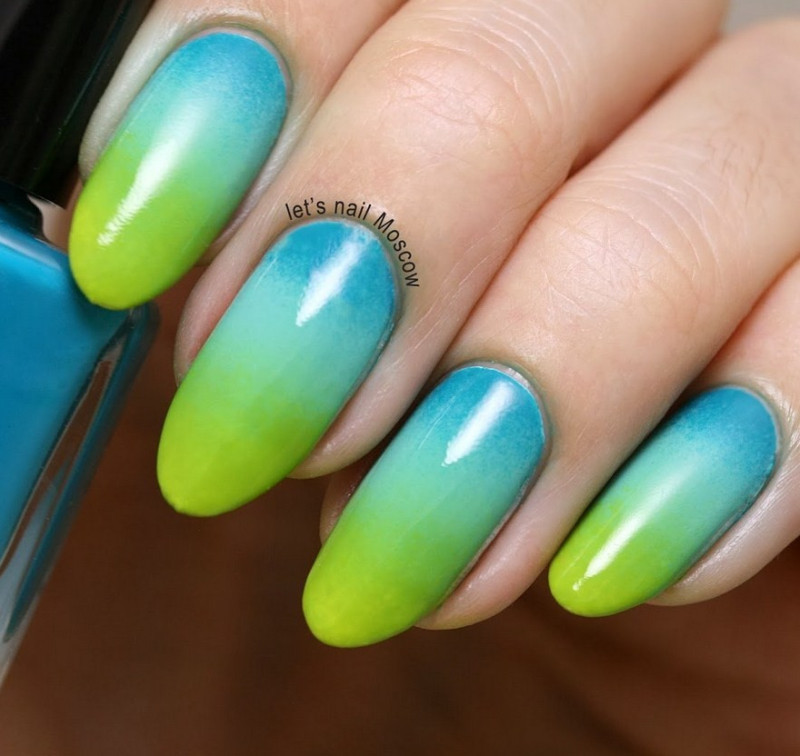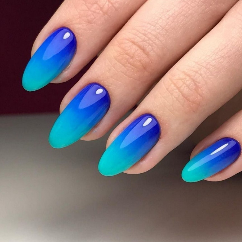 Синий. Весьма распространённый вариант – трёхцветный градиент из родственных оттенков синего (от тёмного к более светлому). Также переходы делают с зелено-синей гаммой, присущей яркому летнему маникюру.