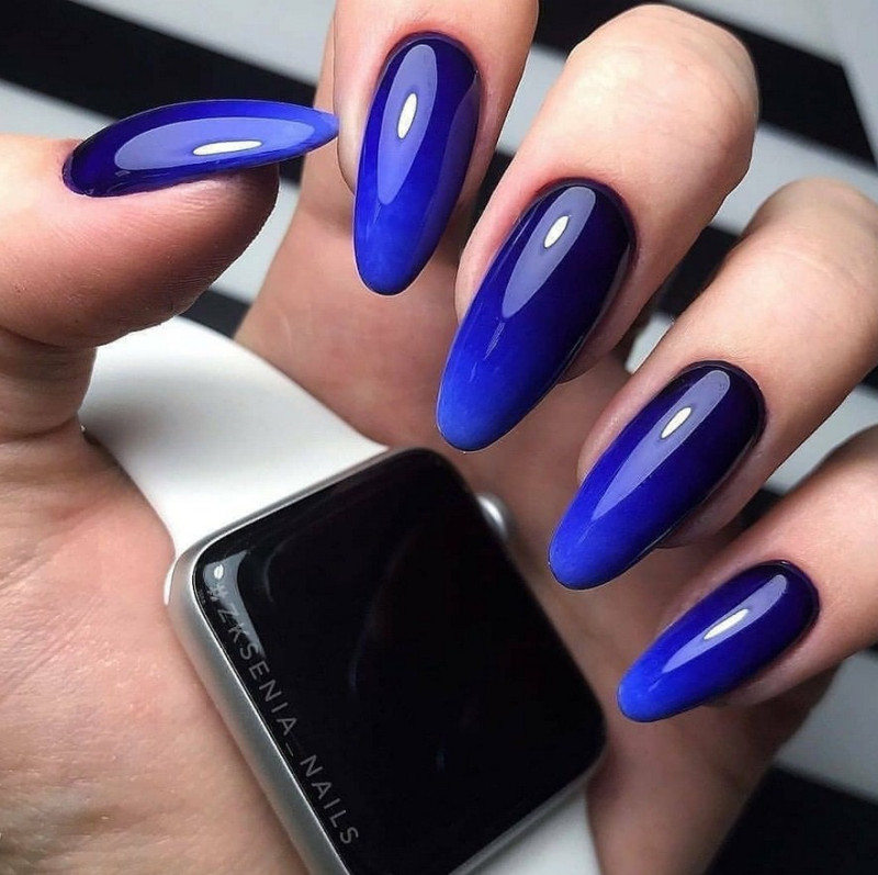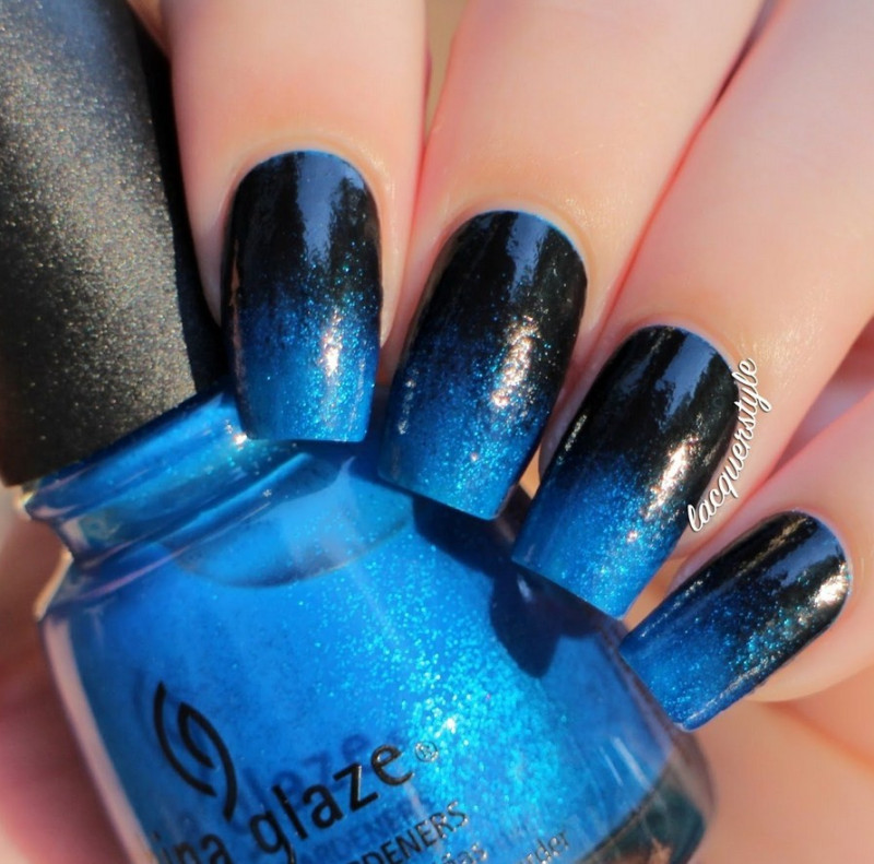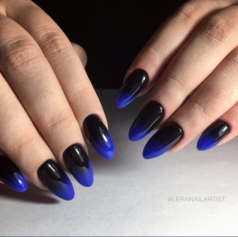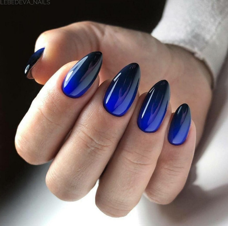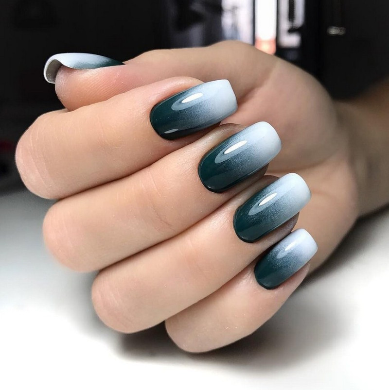 Синий. Весьма распространённый вариант – трёхцветный градиент из родственных оттенков синего (от тёмного к более светлому). Также переходы делают с зелено-синей гаммой, присущей яркому летнему маникюру.