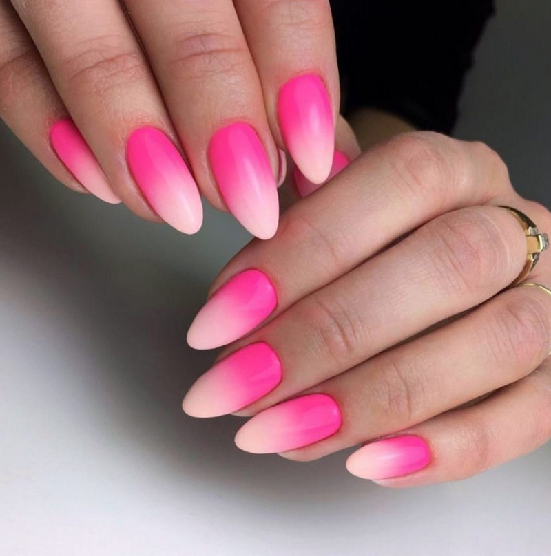 Розовый. Розовый маникюр градиент – классика нейл-дизайна. Он невероятно женственный и элегантный, подходит для ногтей любой формы и длины. Можно выбрать сразу несколько тонов розового по насыщенности, либо сделать градуировку в розово-белых, розово-серых оттенках.