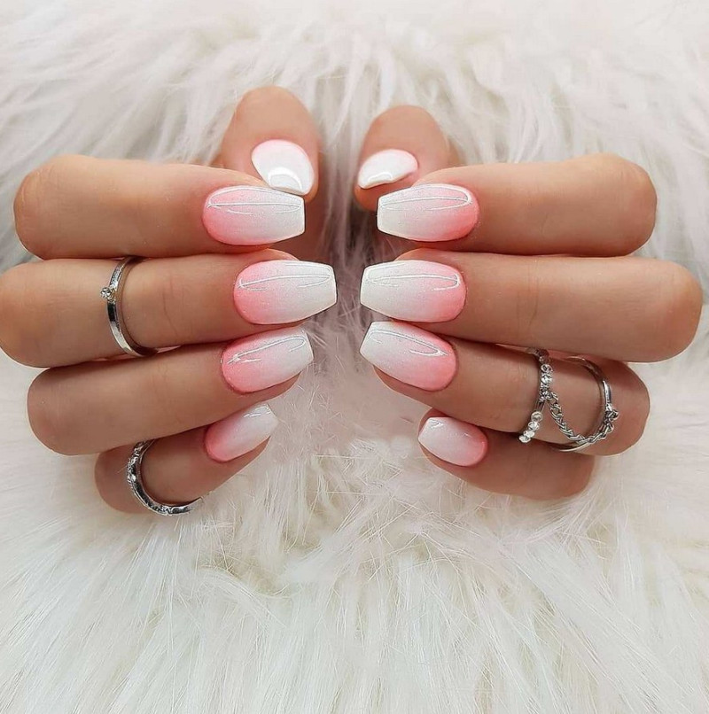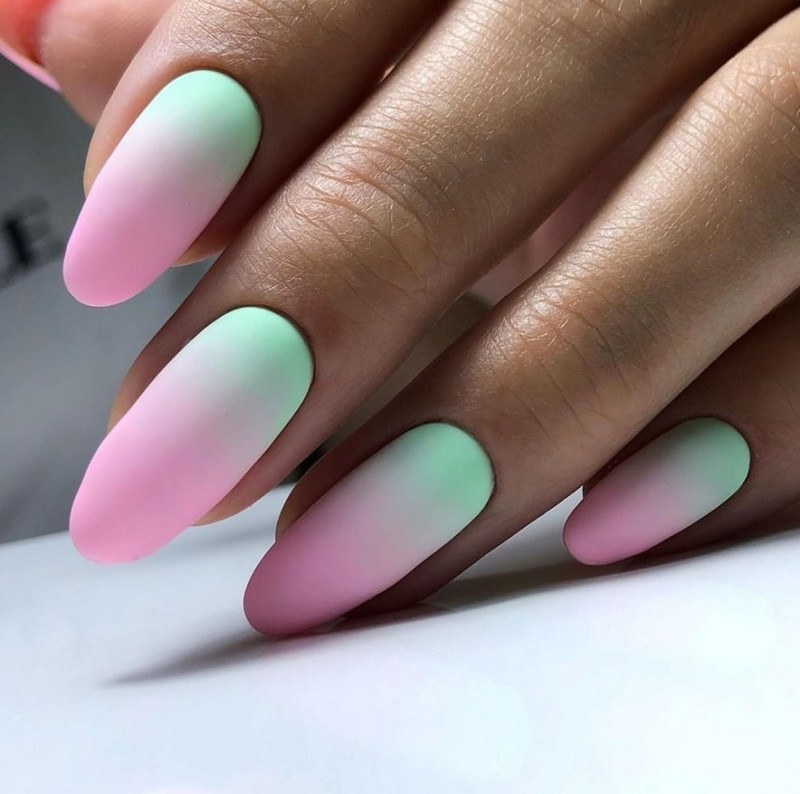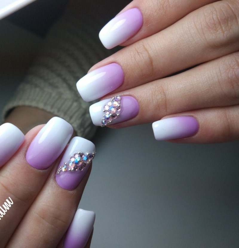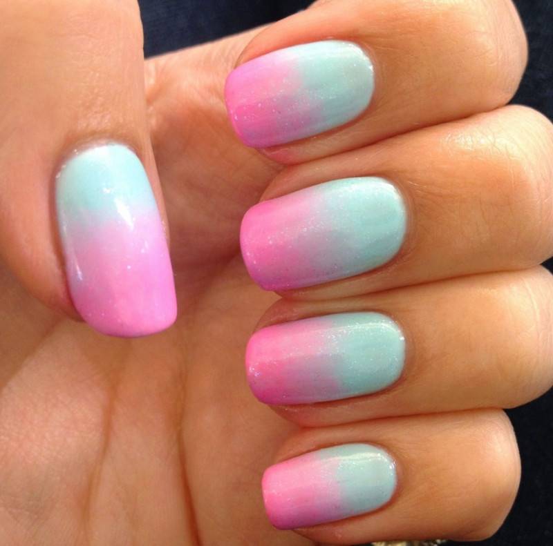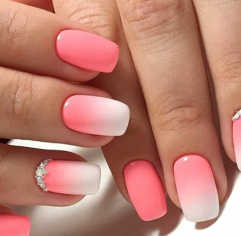 Нежный и женственный вариант омбре. Здесь можно использовать розовый и белый, розовый и другие оттенки палитры. Переход может быть почти невидимым или контрастным. В качестве декора подходит втирка, блестки или рисунки.