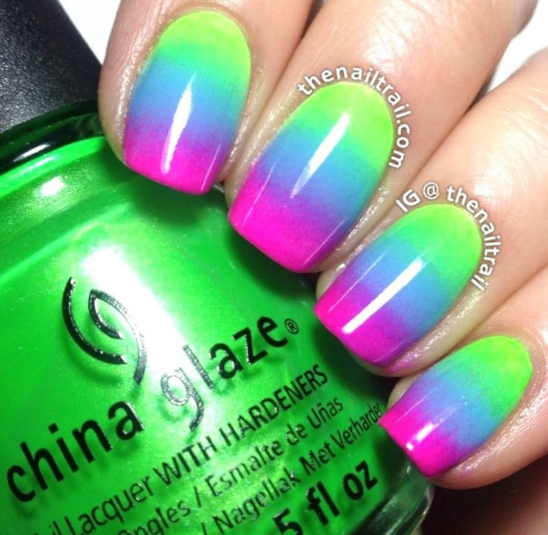 Яркий градиентный маникюр, как на данном фото, будет радовать свою обладательницу, как днем, так и вечером в ночном клубе. Он сделан тремя неоновыми лаками для ногтей при помощи губки