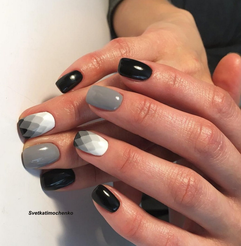 Черный — универсальный монохром. Он сочетается с любым другим оттенком. Это свойство позволяет использовать его в качестве базы для сложного омбре. Начинать от лунки лучше с густого черного, выполняя плавный переход к красному, синему, серому, белому. Или наоборот, начать с прозрачного и сделать кончик ногтя черным.