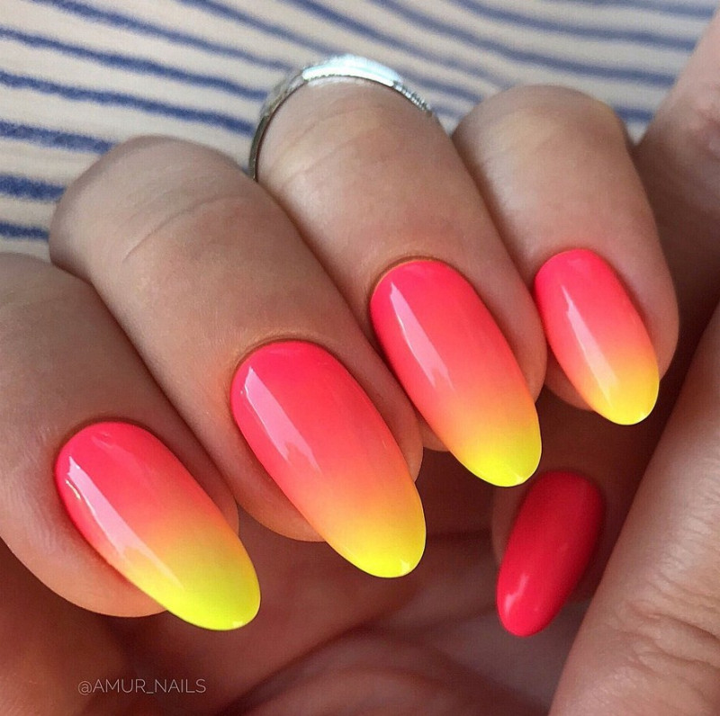 Но как подобрать удачное сочетание оттенков для маникюра омбре? Пожалуй, самым правильным будет ответ «на свой вкус». Однако есть и проверенные нейл-мастерами идеи. К ним относится, например, союз оттенков нюда и неоновых цветов. На первый взгляд, они могут показаться вам несовместимыми, но на практике смотрятся гармонично. Удивительно, но кислотные неоновые оттенки очень красиво «растворяются» в нюдовой палитре при создании мягкого перехода.