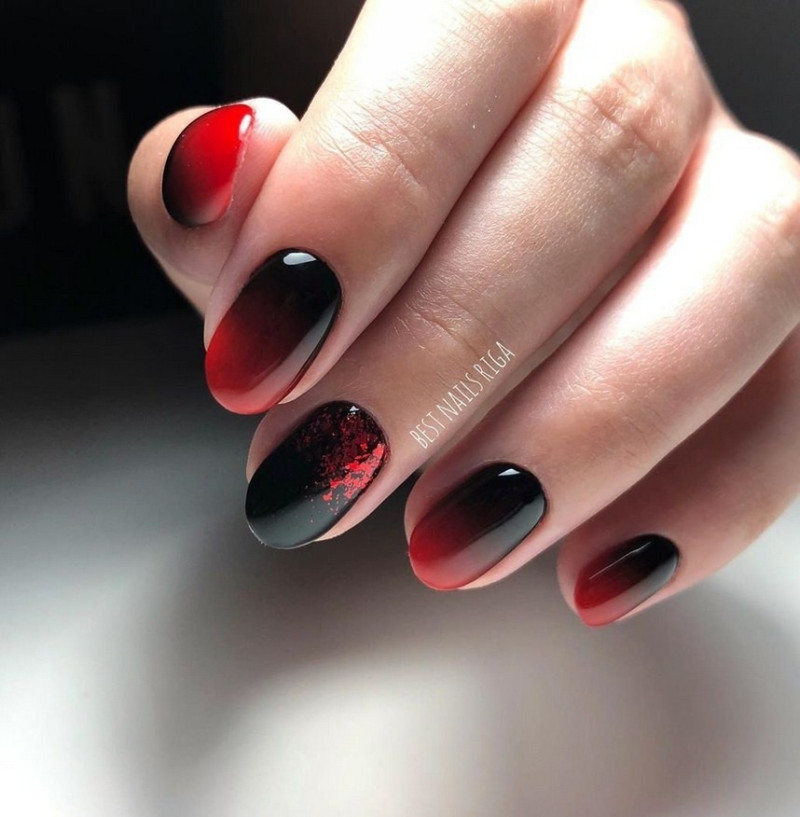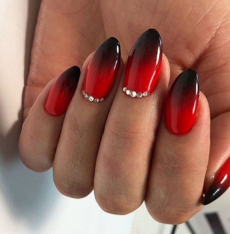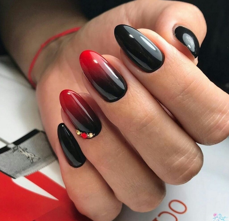 Один из самых популярных вариантов маникюра омбре. Красный с плавным переходом в чёрный подчёркивает ухоженность длинных ногтей, эффектно оттеняет кожу рук. Такой маникюр притягивает к себе взгляды, создавая образ яркой и привлекательной женщины.