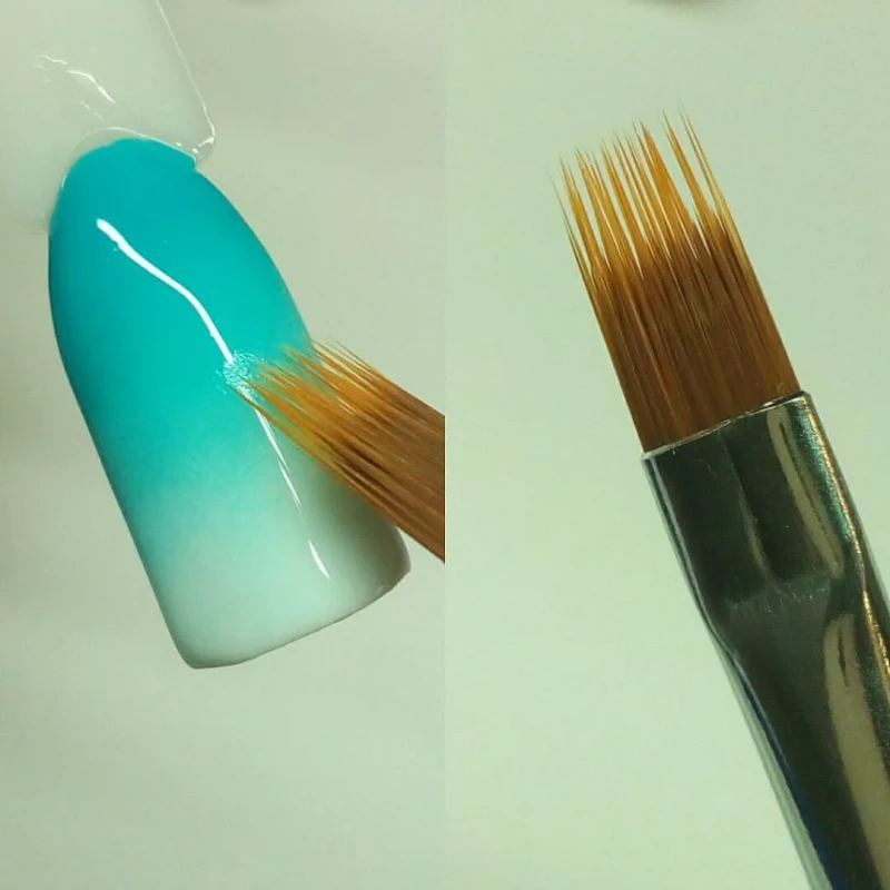 - Чистой кистью смешиваются границы цветов. Сделать это можно при помощи легких, похлопывающих движений. Таким способом проще всего регулировать размещение границы перехода на ногтевой пластине.