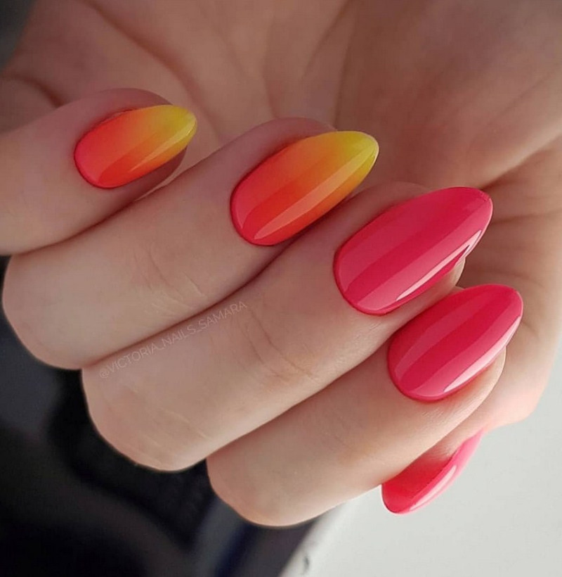 От нежной пастели до яркой фуксии, от мягкой растяжки оттенков к контрастным переходам – мастера предлагают множество вариантов для маникюра омбре. Розовый цвет гармонично сочетается с бежевыми, голубыми и даже жёлтыми тонами. Смелые девушки выбирают градиентный переход от фуксиевого к чёрному. Отличный варант для весеннего дизайна коротких ногтей.