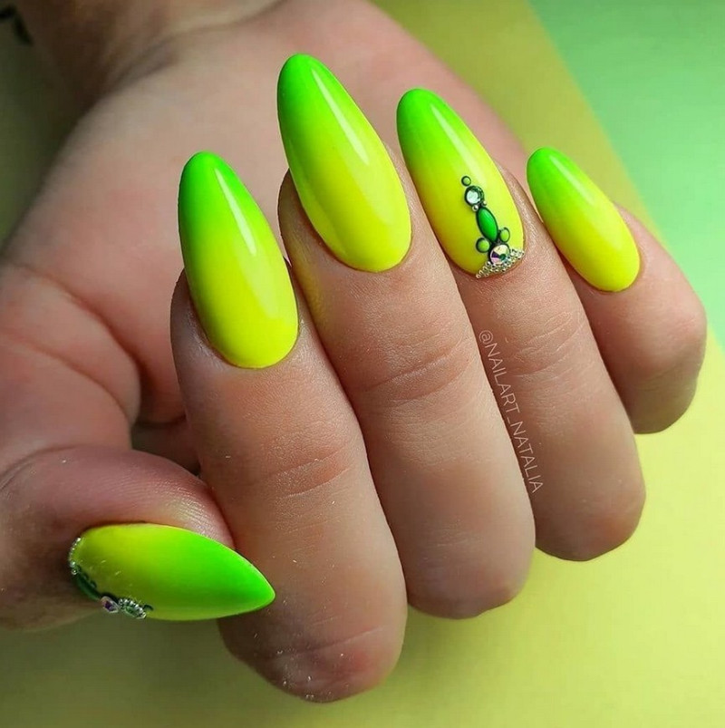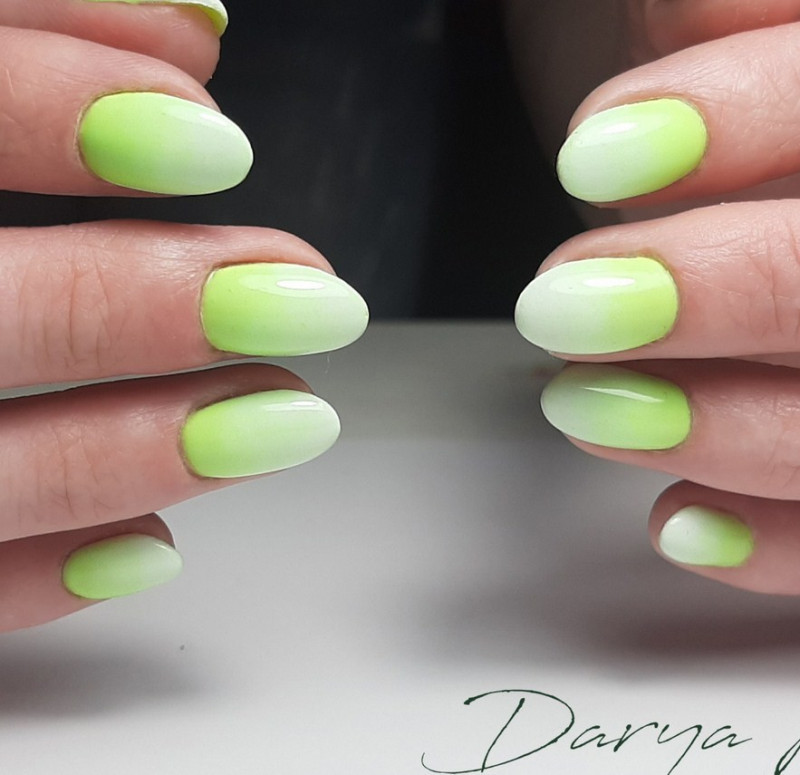 Зелёный. Черно-зелёный или жёлто-зелёный градиент – выбор женщины, ценящей свободу и смелость. Яркий дизайн не требует дополнительного декора, поскольку сам по себе сразу становится изюминкой образа.
