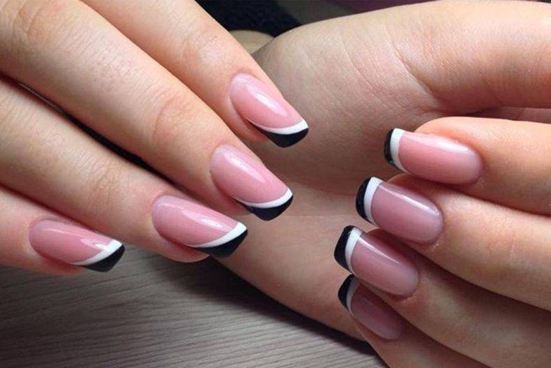 Для квадратной формы стоит выбирать четкие линии. Если выбираете вариант с пересечением, угол должен быть острым или прямым. Тупой уголок с большим градусом еще более расширит пластину. При короткой длине такие ноги будут смотреться лопатой, а сам маникюр слишком тяжелым.