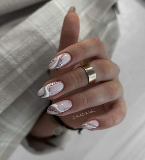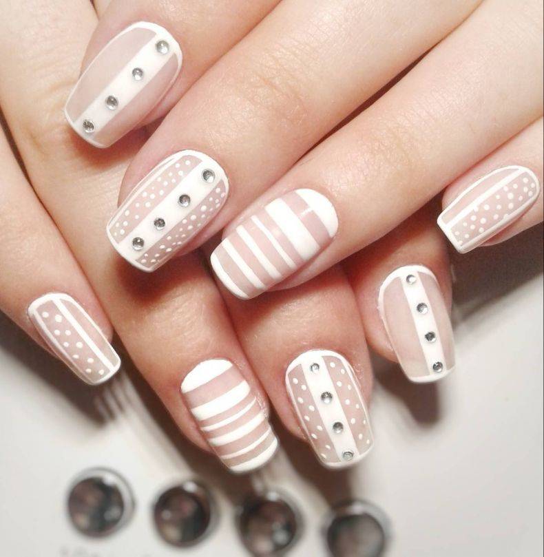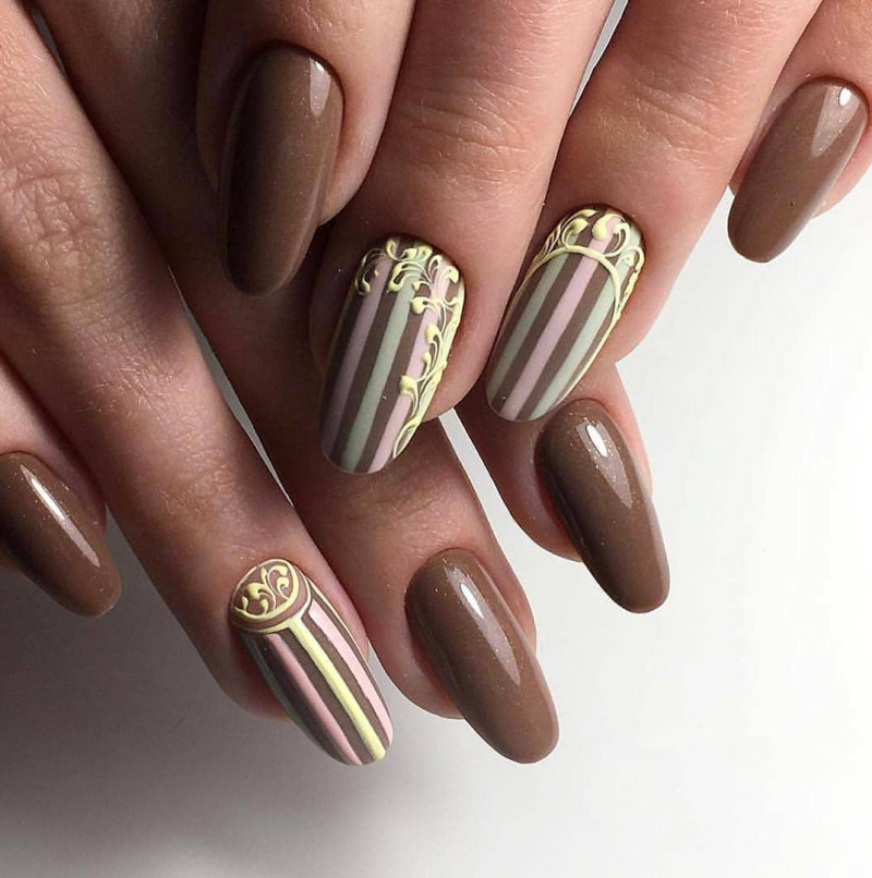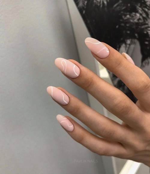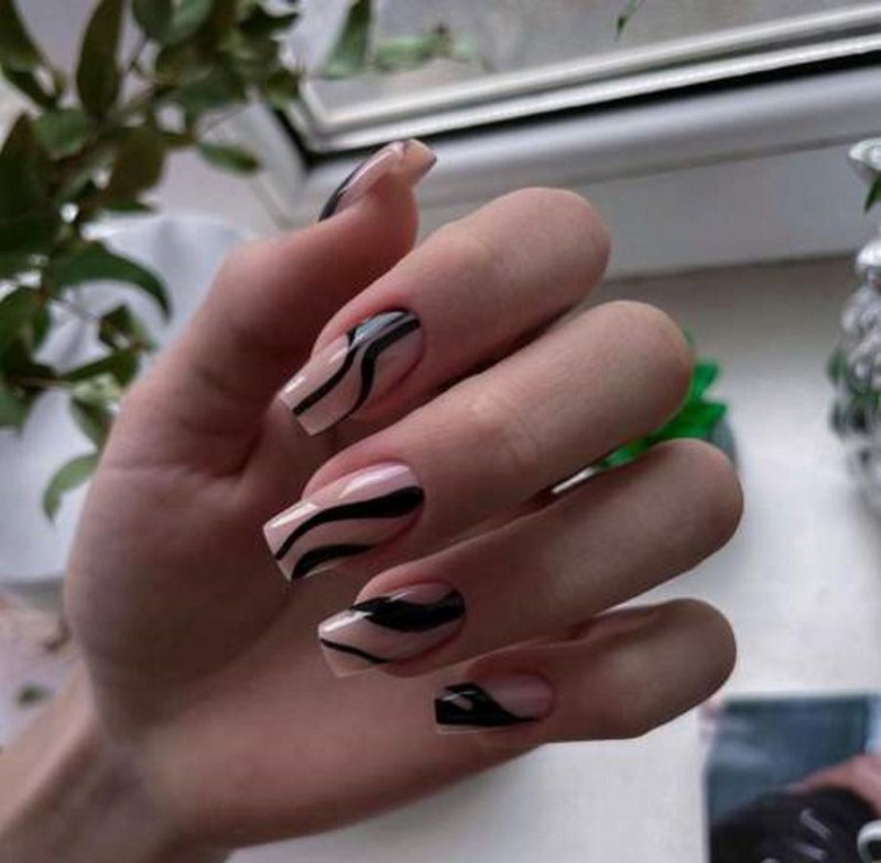Маникюр нюд с полосками скромный, но невероятно стильный и притягательный. Лучше использовать вертикальные линии контрастного тона, либо волнистый декор белого, коричневого, чёрного цвета.