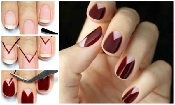Если вы когда-нибудь пробовали делать френч в домашних условиях, то помните, каких усилий стоит сделать ровную и аккуратную полосочку на всех ногтях. Даже использование специальных наборов для французского маникюра не всегда спасает ситуацию. Липкие ленты позволили взглянуть на френч по новому. Все что нужно сделать – приклеить полоску на необходимом расстроянии от края ногтя, причем делать это не обязательно ровно. Взгляните на фото – V-образная форма френча выглядит свежо и оригинально.