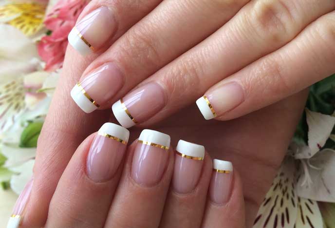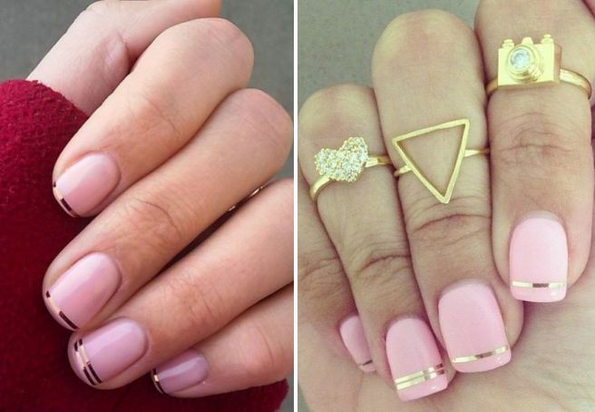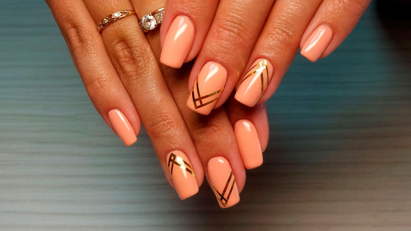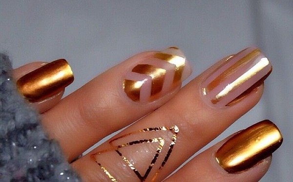 Одним из видов дизайна ногтей является маникюр с использованием золотой фольги. Такой вариант становится особенно популярным осенью или летом. В холодное время года золотистые полоски сменяются более спокойными оттенками.