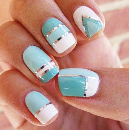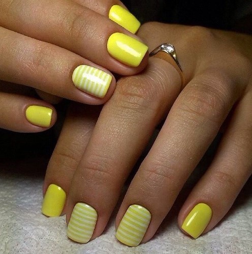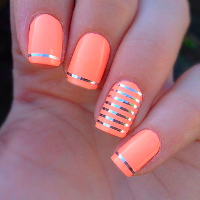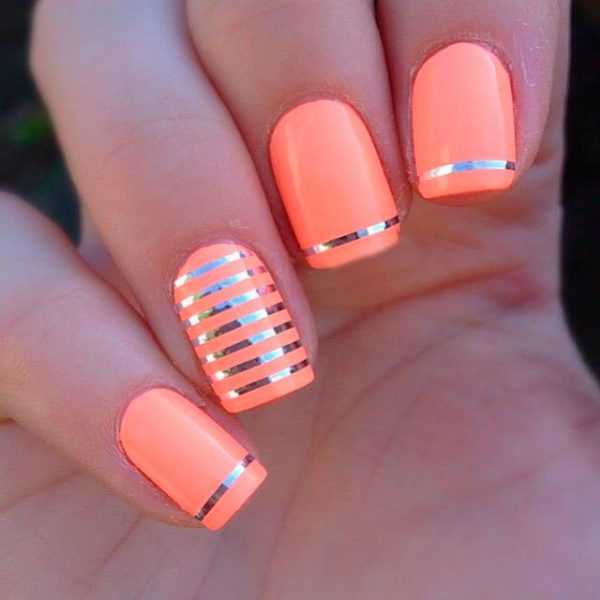 Полосатый дизайн выглядит невероятно оригинально и непременно заставит окружающих обратить внимание на ваш маникюр. Все что нужно – нанести на ногти обычный или гель лак нужного цвета, а после того, как он полностью высохнет – декорировать липкой лентой. Также как в предыдущем варианте с геометрическим дизайном, полосочки можно оставить или же покрыть сверху лаком контрастного цвета и удалить после его высыхания