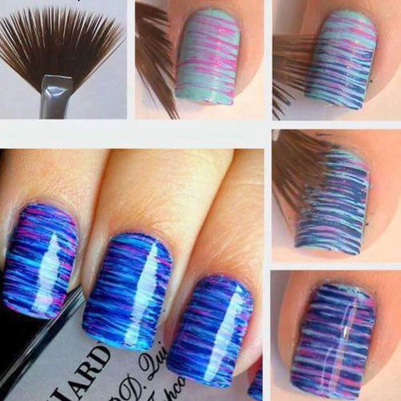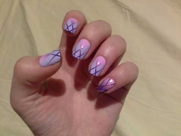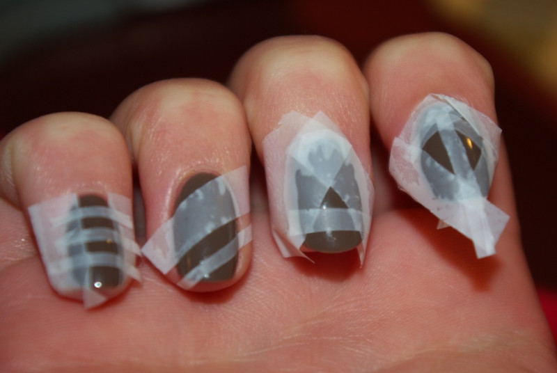 Накрасив ногти понравившимся лаком, хорошо просушить их и нарисовать полоски лаком другого цвета при помощи тонкой кисточки. К поверхности ногтя приклеить липкую специальную ленту, образуя понравившийся узор, а затем покрыть его слоем лака