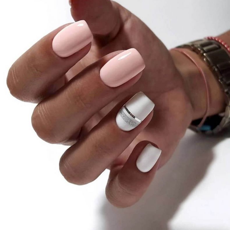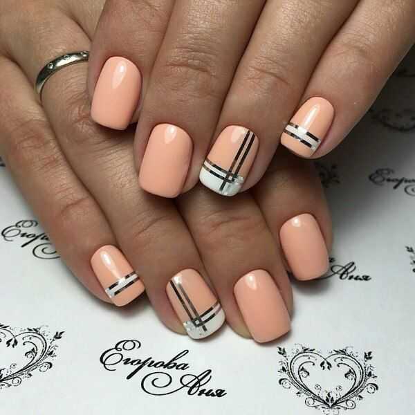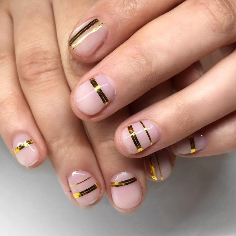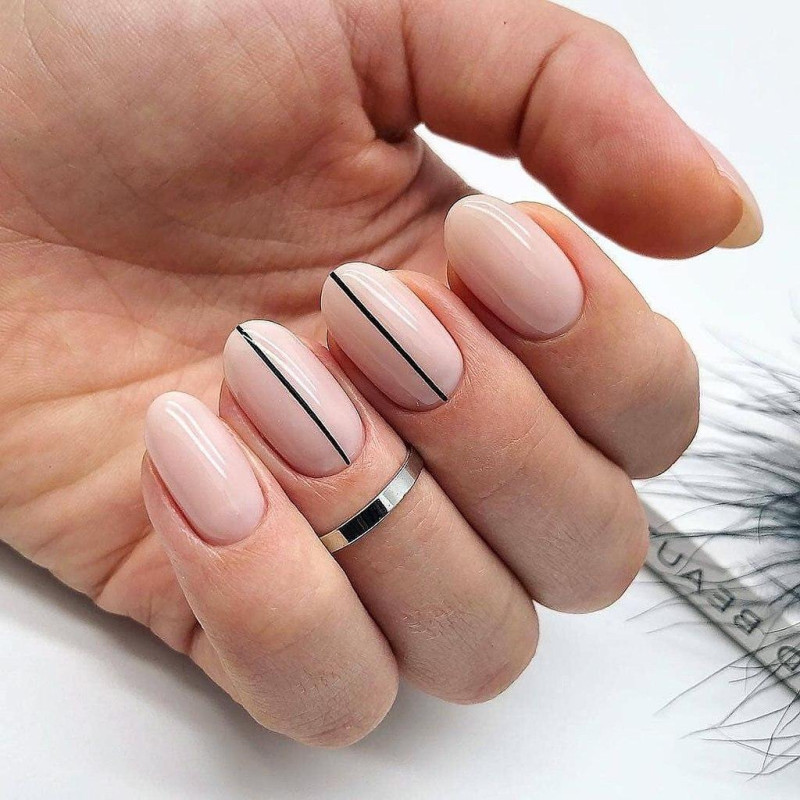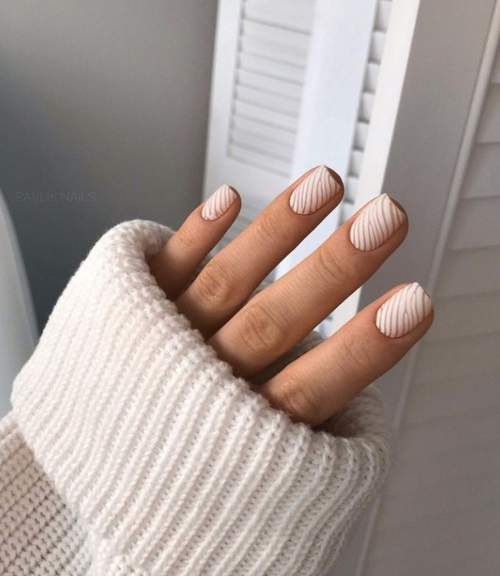 На коротких ногтях в сезоне 2021-2022 хорошо выглядят нюдовые тона. Полоски можно размещать в любом направлении, но чтобы визуально удлинить ноготь, лучше размещать полоски вертикально. Такой дизайн может сгладить неровности на ногтевой пластине. При выборе формы лучше отдавать предпочтение мягкому квадрату и «миндалю».