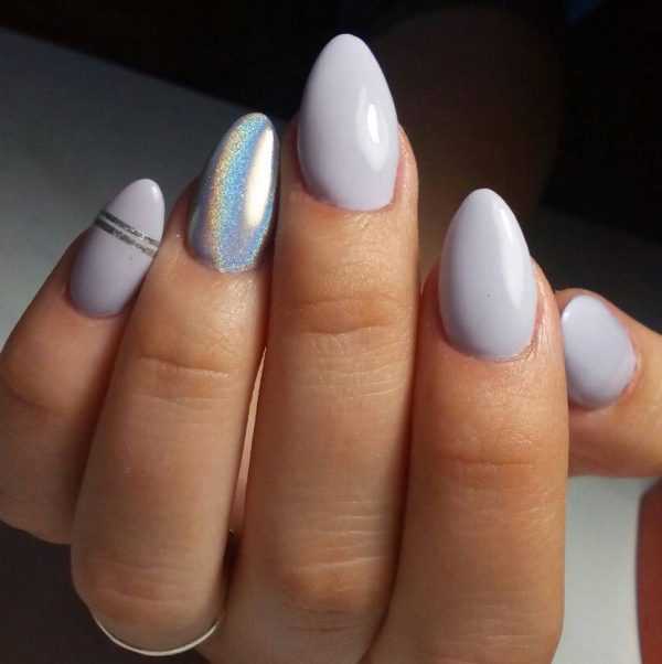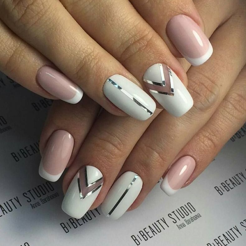 Белое серебро. Еще одна тенденция — это наложение на ноготки серебряной фольги на чисто-белую или молочную основу. Можно использовать как глянцевый, так и матовый. Все зависит от ситуации. Глянец больше подойдет для праздничных мероприятий.