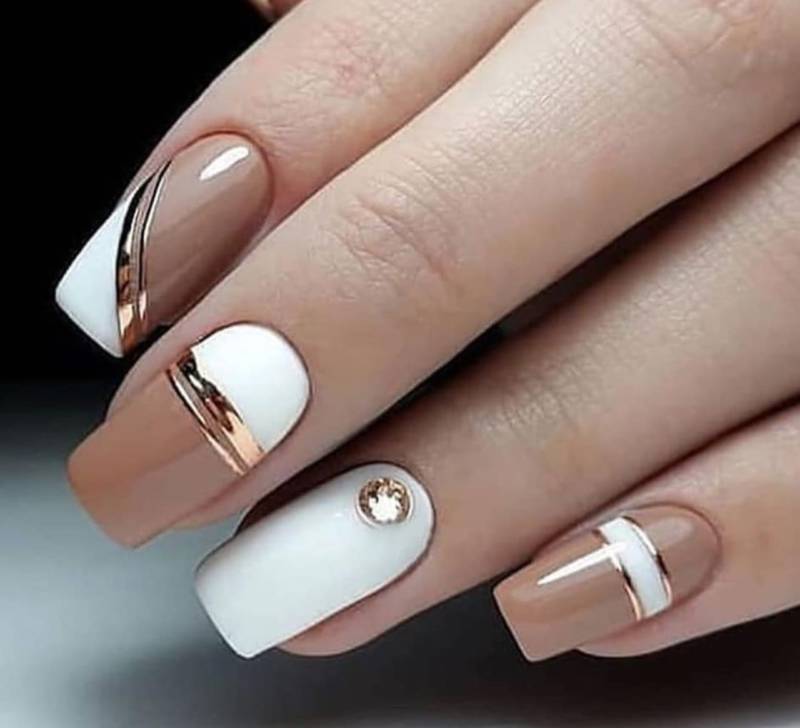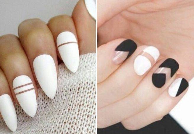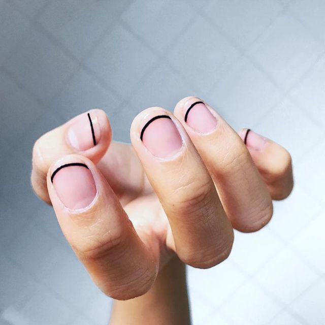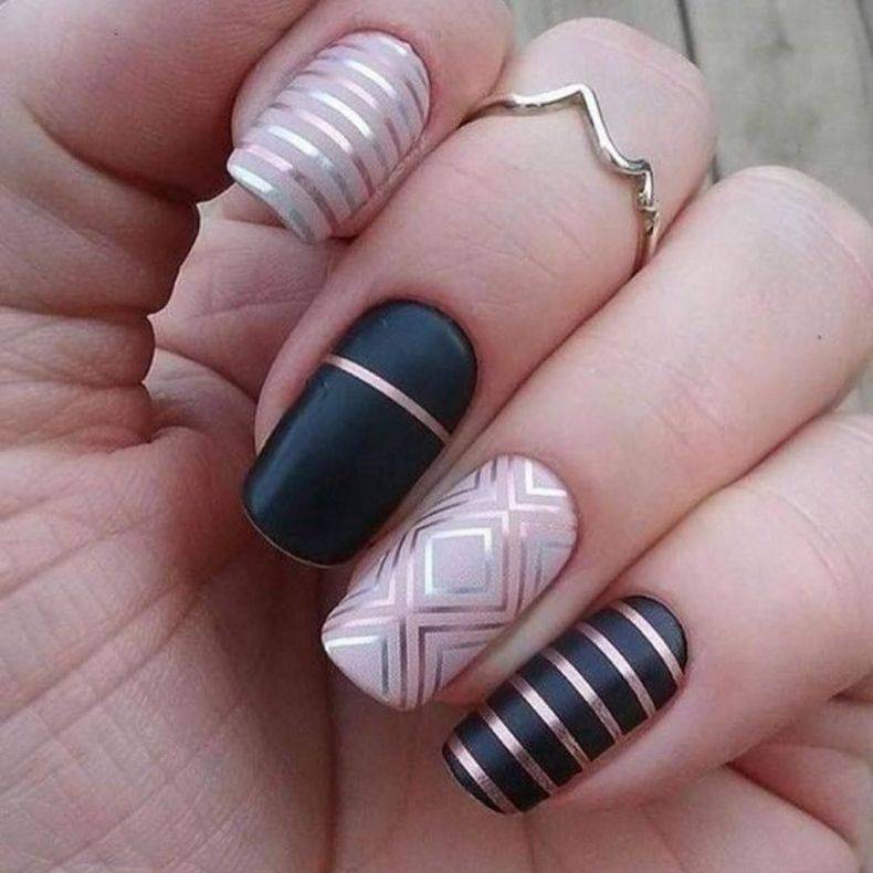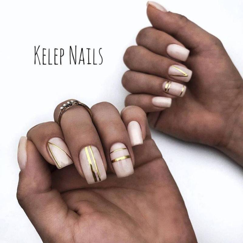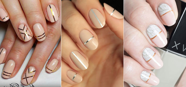 Оформление ногтевой пластины полосками и лентами сочетается и с другим минималистичным геометрическим дизайном: точки, фигуры, фольга