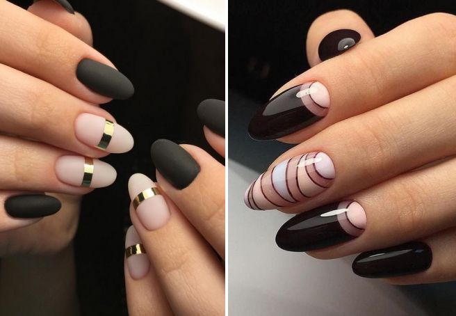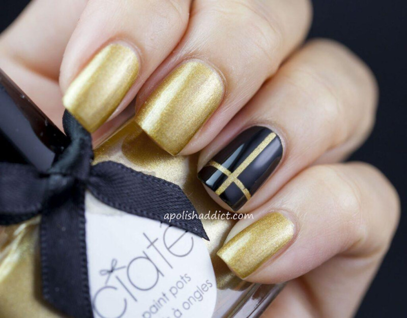Черное золото. Еще один интересный праздничный и яркий Нейл-арт. Основа — черный цвет и золото. Элегантно и экстравагантно. Идеально для длинных или квадратных с закругленными кончиками. Такой вариант трендовых ногтей не нуждается в дополнительных украшениях. Хорошо подходит для создания вечернего образа.