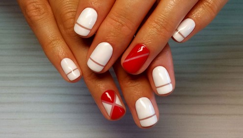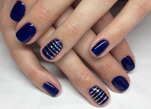 Полосатый маникюр – настоящая находка для летнего морского дизайна ноготков. Украсьте красно-синей полоской один или несколько пальчиков и наслаждайтесь восторженными взглядами прохожих!