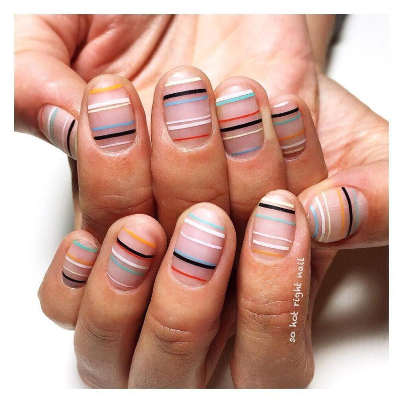 Использование разноцветных полосок — хит прошедшего летнего периода. Ведь такой nail-art неизменной выглядит ярко, задорно и весело. Незаметно тренд перекочевал в осеннюю и зимнюю моду.