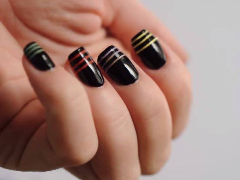- Используйте тонкие или широкие полоски. Полоски могут быть тонкими или широкими, что влияет на итоговый эффект многоцветного маникюра. Тонкие полоски создают более деликатный и элегантный дизайн, а широкие полоски делают маникюр более ярким и дерзким. Выберите толщину полосок в зависимости от желаемого эффекта.