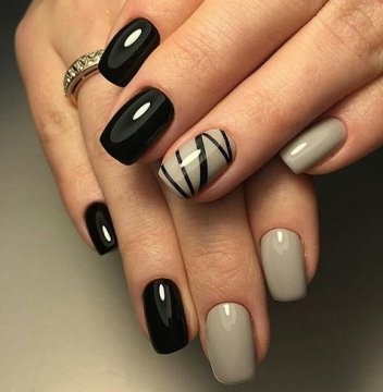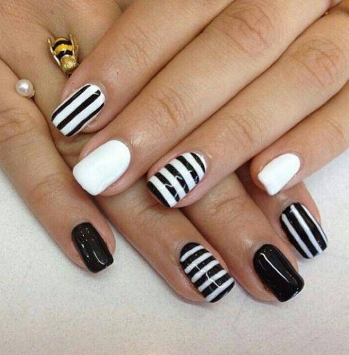 Интересно смотрится маникюр в белую, серую и черную полоску. Такое оформление создает как бы градиент цвета, при этом оставаясь спокойным и не вызывающим. Используются также и варианты с контрастными оттенками, которые смотрятся смело и ярко. Во всяком случае, подобрать удачный дизайн вы сможете и на собственном опыте.