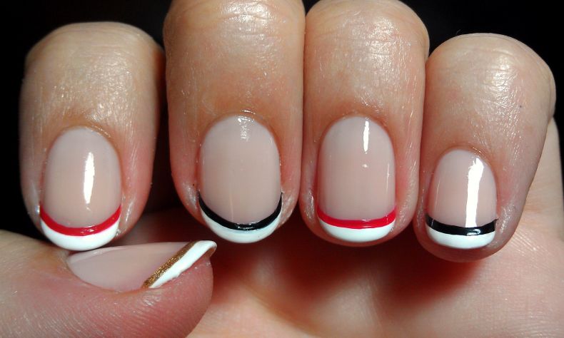Как и классический френч, лунный маникюр требует обновления. Модницы постоянно ищут что-то новое и необычное. Дизайн с лентами – прекрасная возможность сделать образ более интересным. Взгляните на фото, цветные полосы не только упрощают процесс создания «лунки», но и позволяют оригинально оформить ее, изменив форму и очертания.