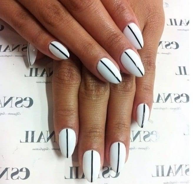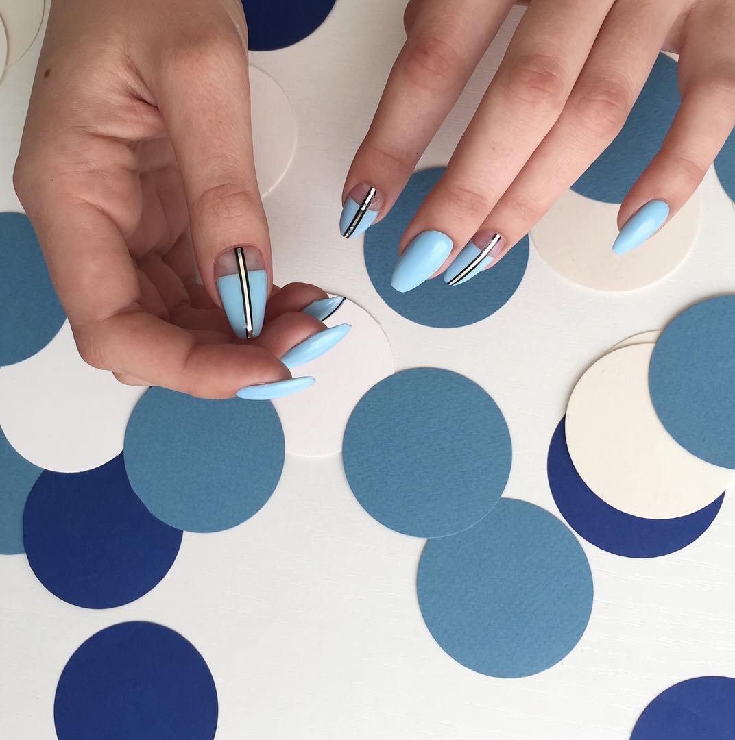 Длинные ногти позволяют выбирать любой вариант полосок. Но не стоит и слишком увлекаться вертикальными линиями. Они могут сделать визуально ногти длинными и тонкими. Не каждой форме рук подойдет такой эффект в маникюре. Здесь отлично подойдет полоска-разделитель. Длины ногтя хватит на то, чтобы создать на пластине сразу несколько зон и оформить их в разных стилях.
