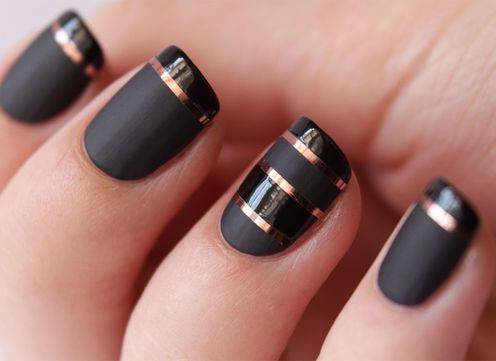 Матовый маникюр создает на ноготках бархатистый эффект, однако чаще всего такой дизайн требует дополнительного декора, так как сам по себе может выглядеть достаточно скучно. В этом случае на помощь приходят ленты, особенно металлических и золотистых оттенков. Они придают ноготкам роскоши, делая маникюр праздничным и презентабельным.