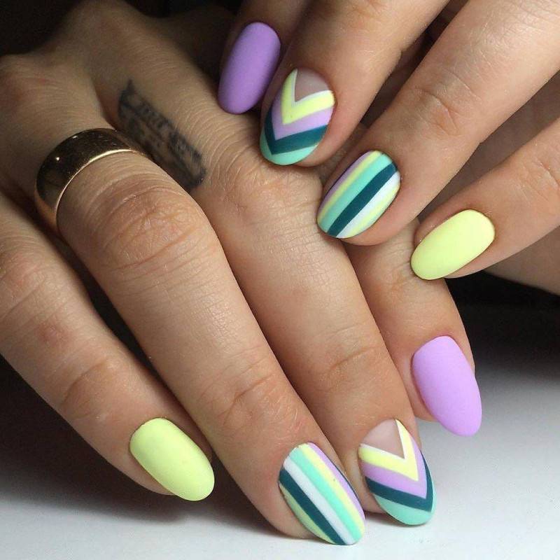 - Играйте с расположением полосок. Многоцветный маникюр с полосками может выглядеть интереснее, если вы измените расположение полосок на каждом ногте. Например, на одном ногте полоски могут быть вертикальными, а на другом — горизонтальными. Это добавит вариативности к дизайну и сделает его более динамичным.