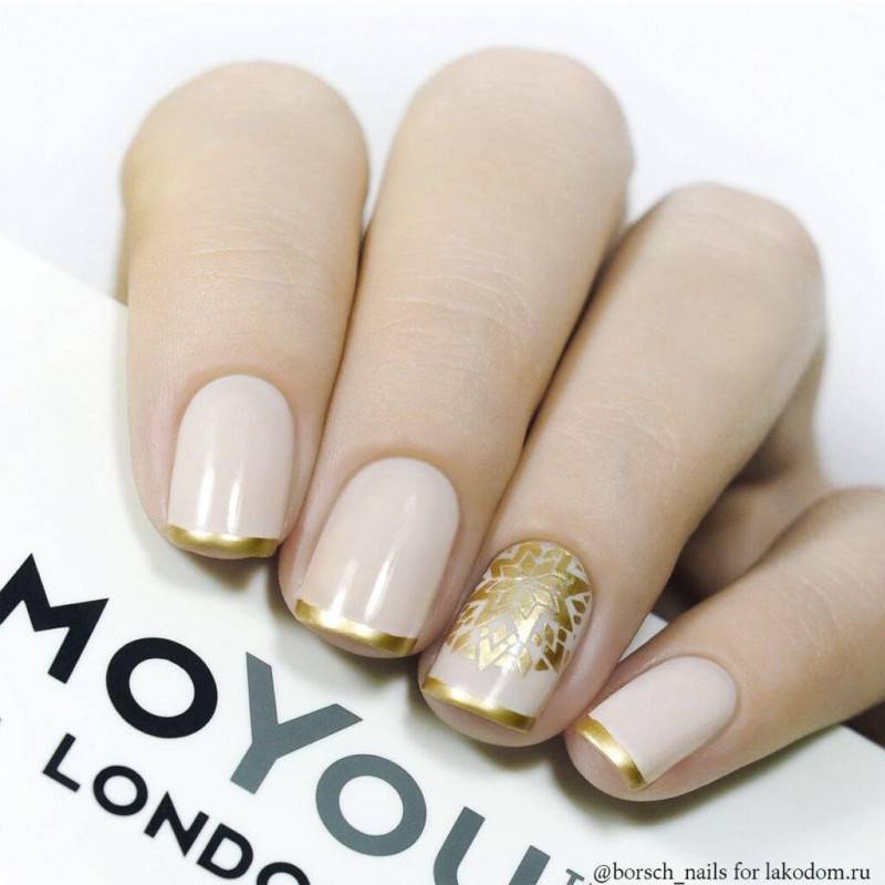 Нюд с фольгой. Нюд помогает сгладить яркость фольги и уравновешивает дизайн. В таком случае фольга наносится не на весь ноготь, а только сверху или снизу. Получается нежная и красивая абстракция. Отлично сочетается сусальная фольга (золотистая, серебристая) с бежевым оттенком. Можно попробовать и дополнительные элементы дизайна в виде страз.