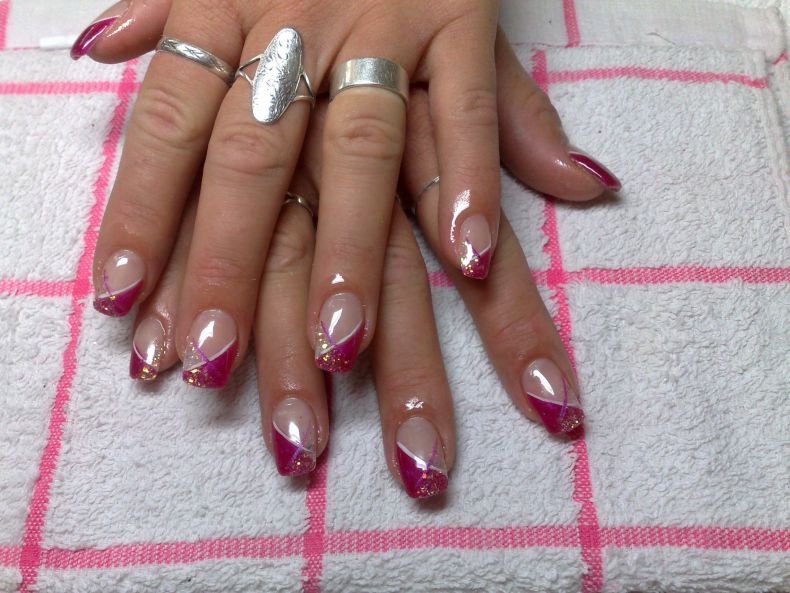 Несмотря на то, что специалисты предостерегают модниц и всегда советуют во всем знать меру, маникюр с лентой можно дополнить стразами, блестками или глиттером. Главное – не переборщить. Небольшие стразы, наклеенные вдоль блестящей линии, глиттер между полосками – все это позволит сделать маникюр еще более ярким и праздничным.