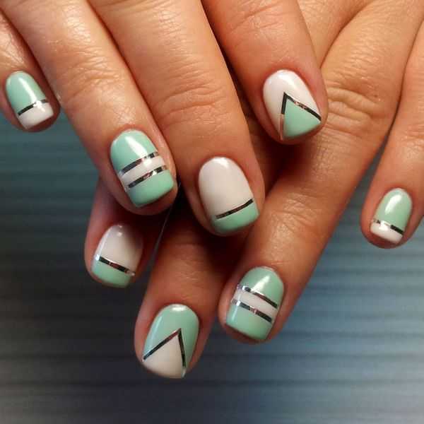 С помощью таких липких полос можно запросто сделать, как повседневный маникюр, так и деловой и вечерний нейл-арт, при этом количество геометрических фигур может варьироваться от одной до нескольких штук.