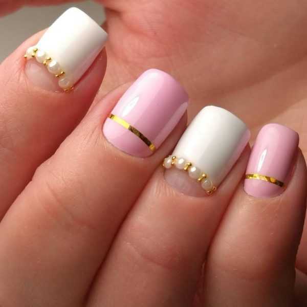 Подчеркнуть хрупкий девичий образ поможет нежно-розовый тон лака в сочетании с ноготками в технике «мрамор» или «кварц», а декор в виде светлых страз, полосок или бусинок сделает этот вариант привлекательным для невест.