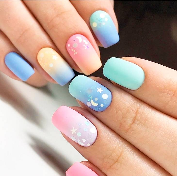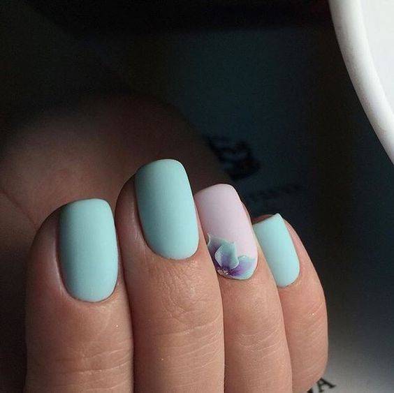 Пастельные оттенки синего цвета невероятно разнообразны: «пыльный», лазурный, небесный, затененный голубой. Отлично гармонируют в маникюре с другими пастельными цветами, в особенности с розовым и персиковым.