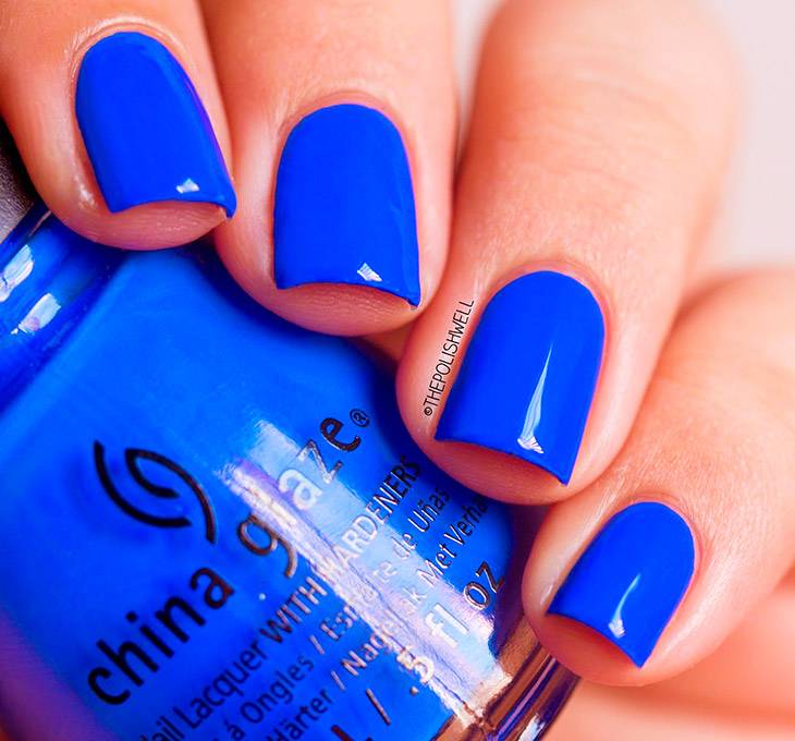 Ярко-синий в глянце — классика маникюра, дающая неограниченную фантазию. От однотонного к множеству цветовых сочетаний, практически беспроигрышный вариант дизайна. Но, как уже говорилось, лучше всего он выглядит именно глянцевым, что подчеркивает его блеск.