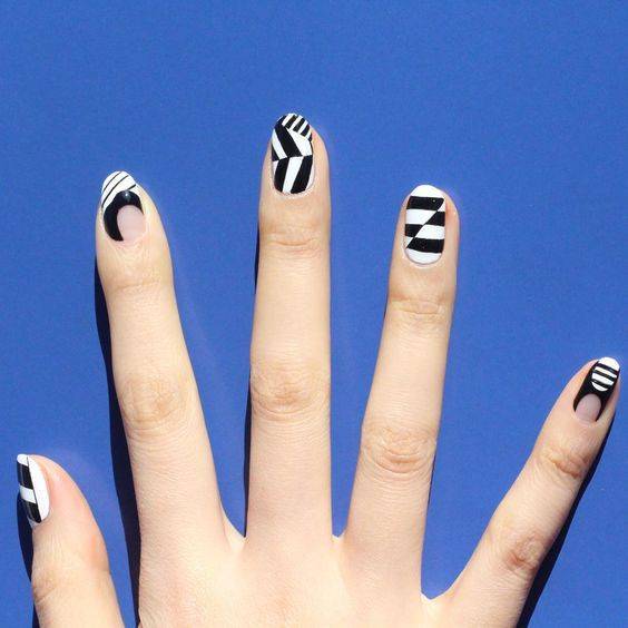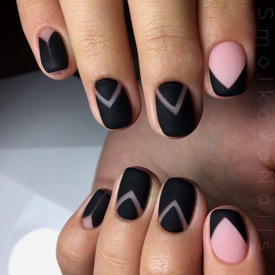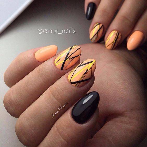 3. Модное веяние в маникюре — контрастные полосы, прямые и ломаные линии. Такой дизайн может быть выигрышным для коротких ногтевых пластин. Эффектно смотрятся блестящие или фольгированные линии на матовом покрытии и, наоборот, — матовые полосы на глянце. Также в моде декор из геометрических фигур.