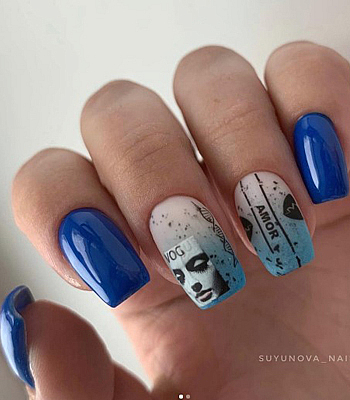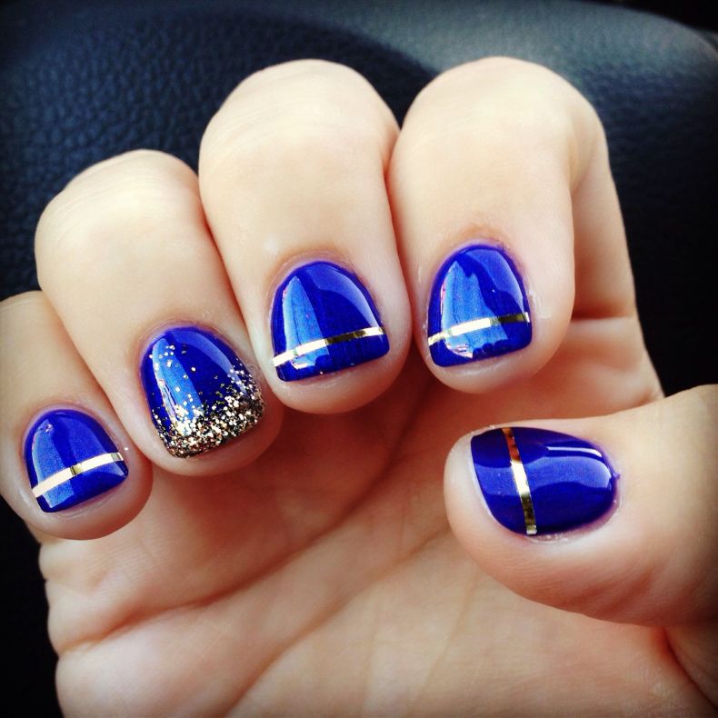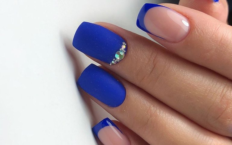 Как ни странно, но для коротких ногтей синий гель-лак тоже подходит. Только не нужно городить на ногтях слишком замысловатые рисунки. Лучше для декора использовать старые добрые стразы и блестки. Тем более что маникюр со стразами выполняется очень быстро и легко и не требует специальных навыков. Хорошо смотрятся короткие ногти с синим матовым маникюром. В дизайне лучше сочетать синий со светлыми оттенками, такими как белый, молочный, песочный, бежевый и т.д. Ноготь будет смотреться более длинным, если сделать полупрозрачный дизайн правильной формы. Линии в рисунке должны быть вертикальными.