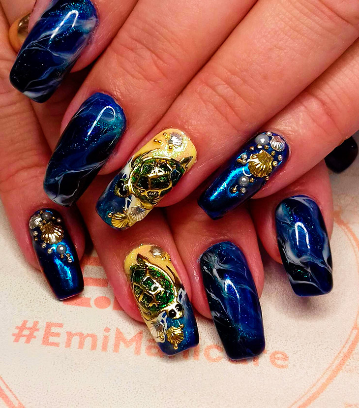 - Стоит отдельно выделить 3Д-лепку, чаще всего этот вариант декора коротких ногтей в синем окрасе самый результативный;