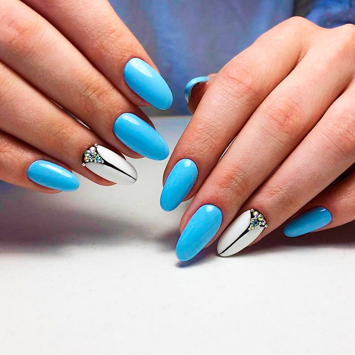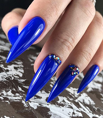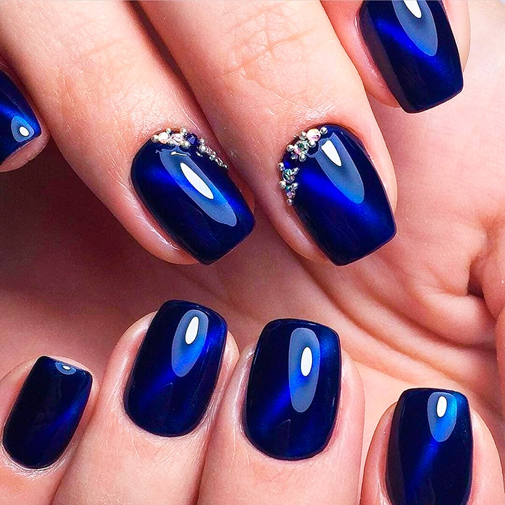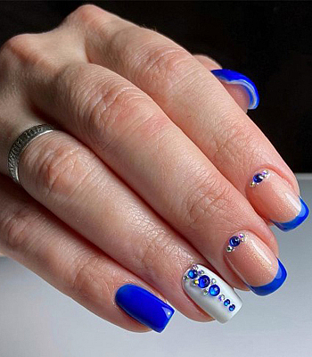 Стразы. Для синего маникюра можно использовать серебряные и золотые стразы либо также синие, но другого оттенка. Стразами обычно украшают не все ногти, а один-два либо используют их очень умеренно, чтобы не перегружать маникюр.