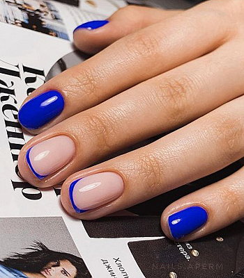 Не обойдем стороной и тему классических видов nail-дизайна, а именно французского и лунного маникюра. На сегодняшний день появилось множество различных комбинаций этих традиционных дизайнов. Часто в оформлении ногтей преобладают прямые геометрические линии. Стирается четкая грань между френчем и лунным дизайном, они могут быть скомпонованы в одном маникюре. Классический маникюр дополняют новыми аксессуарами для ногтей, выдумывают новые техники и т.д. Маникюр с синем цвете даже стилизованный под классику уже не выглядит уныло и скучно. Примеры вы можете увидеть на фото.
