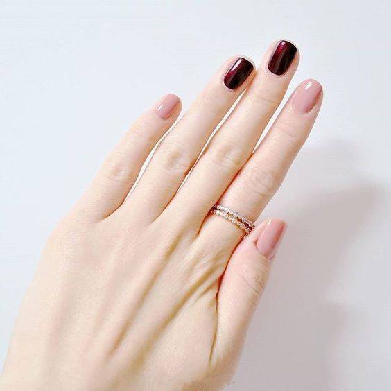Комплементарное сочетание предполагает комбинацию двух оттенков расположенных друг напротив друга в цветовом круге. Гармоничным тандемом в этом случае будет: хаки + фиолетовый, синий + коричневый, бордо + цвет травы. Да, это сочетание не для простых повседневных маникюров, комплементарные цвета всегда выглядят максимально контрастно друг с другом. Для полной гармонии мастера нейл арта рекомендуют использовать одинаковые по степени яркости оттенки.