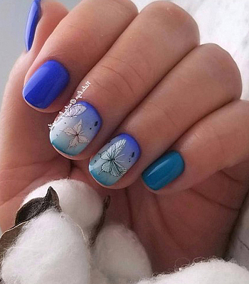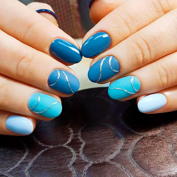 Сложно и интересно выглядит грамотное сочетание нескольких оттенков синего в одном маникюре. Переход может быть выполнен на каждом ногте — с четкой границей, размытием или градиентом, либо темными и светлыми оттенками декорируются разные ногти.
