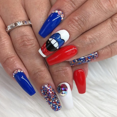 Для обладательниц коротких ногтей можно выбрать красно-синий глиттер. Отличным выбором станет и роспись в красно-синие треугольники. Уместно будут смотреться и рисунки в виде флагов.