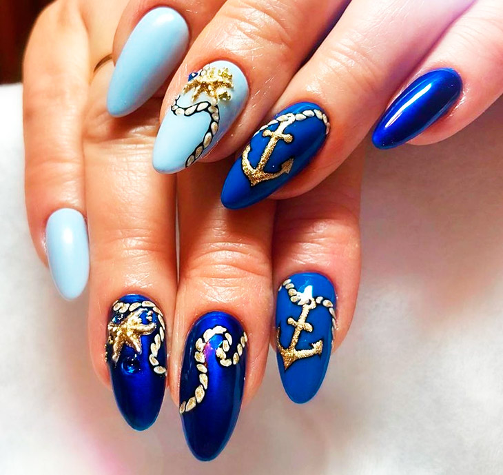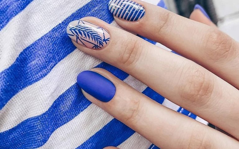 Сочетание синего и белого в летнем маникюре — это отсылка к морской тематике, которая может быть поддержана соответствующими рисунками или добавлением красного цвета.