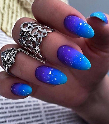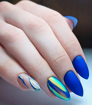 Когда другие цвета уступают в неоне, где выдерживают только яркие оттенки — синий ни капли не проигрывает. Универсальное сочетание мерцающего неонового и ядовитого хамелеона, вкупе с острой формой, поможет создать «дерзкий» и смелый маникюр. А вот на короткие ноготки делать хамелеон не стоит, не раскроется эффект.
