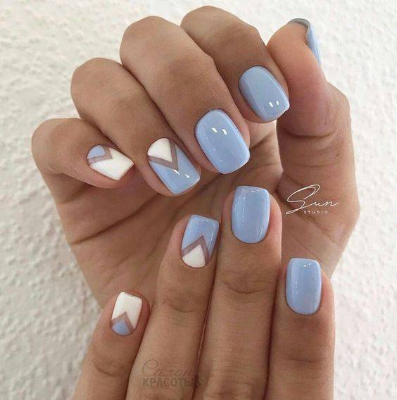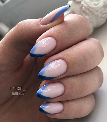 6. Элегантно выглядит синий френч на светлом фоне — треугольный или овальный, на заостренных, закругленных или квадратных пластинах. Чем светлее оттенок синего, тем более воздушным будет маникюр.