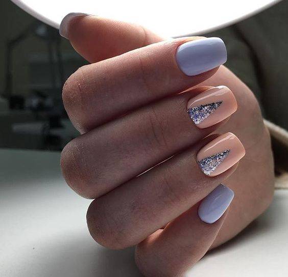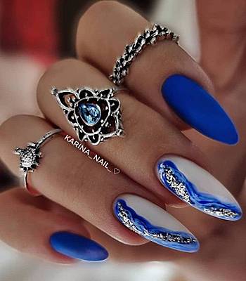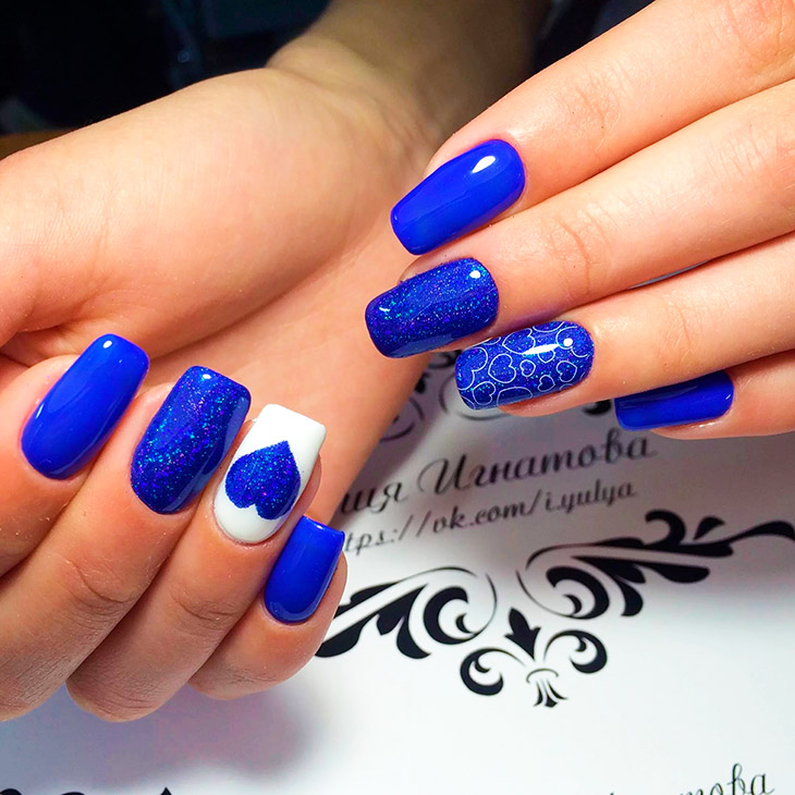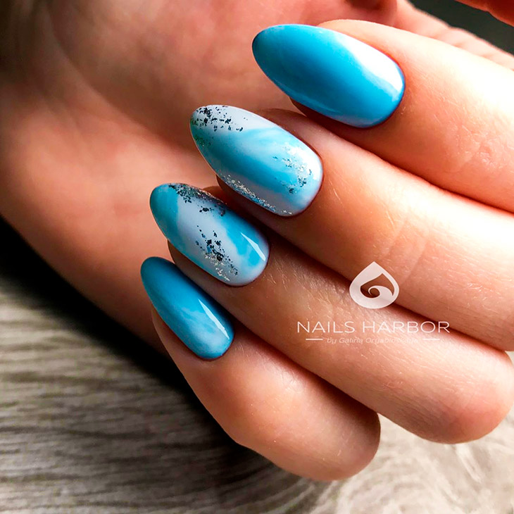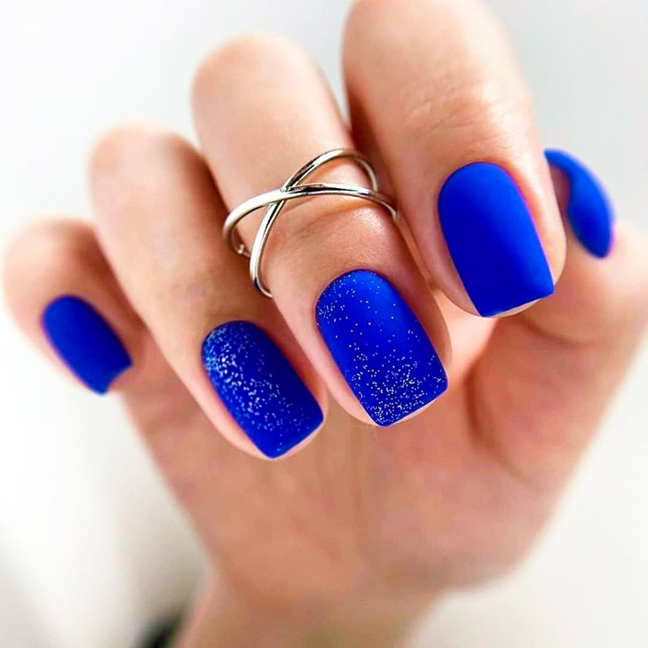Глиттер. Блестки гармонично смотрятся с любыми оттенками синего. Это может быть френч, блестящие лунки или полное покрытие отдельных ногтей.