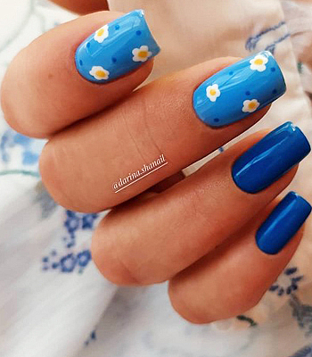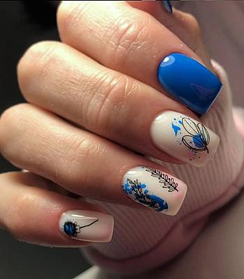 Летом и весной цветы появляются не только на клумбах, но и на ногтях. Если нужен дизайн поскромнее, выбирайте модный синий маникюр «веточки» с небольшими бутонами на полупрозрачной бежевой основе.