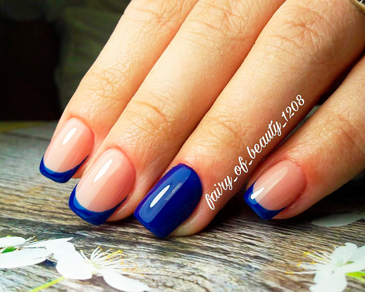Французский маникюр прекрасен в любом своем воплощении, не стал исключением и синий колер. Красивый синий френч лучше всего исполнять на овальных ноготках, ведь так он будет невероятно нежным и романтичным, а вот прямоугольная форма больше уместна для повседневности и офисных луков.