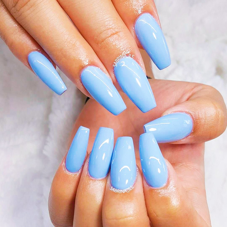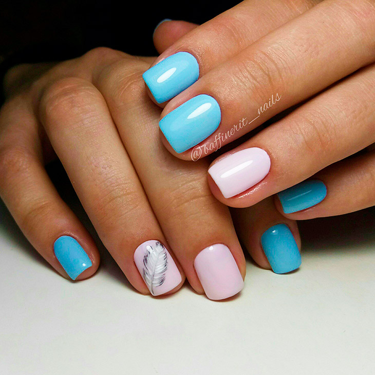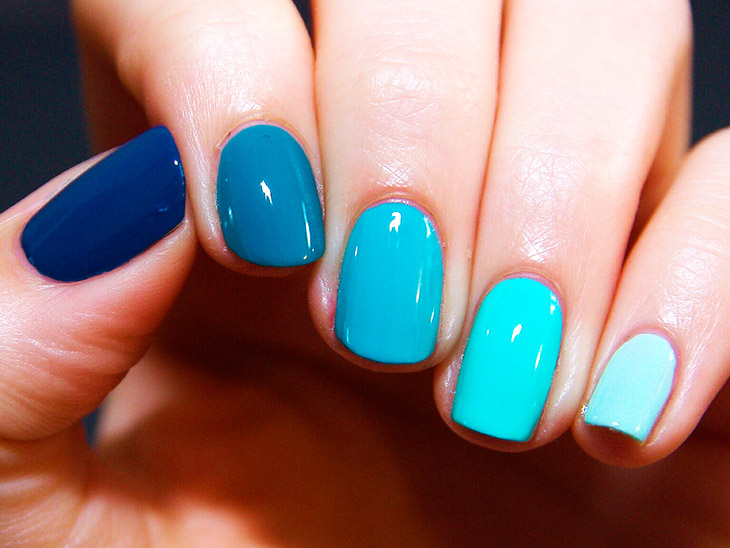 - По возможности отдавайте светлым оттенкам синего, учитывая значительную цветовую гамму — все светлые нежные оттенки голубого, бирюза, морская волна и деликатный вариант с лаком цвета лепестков незабудки;